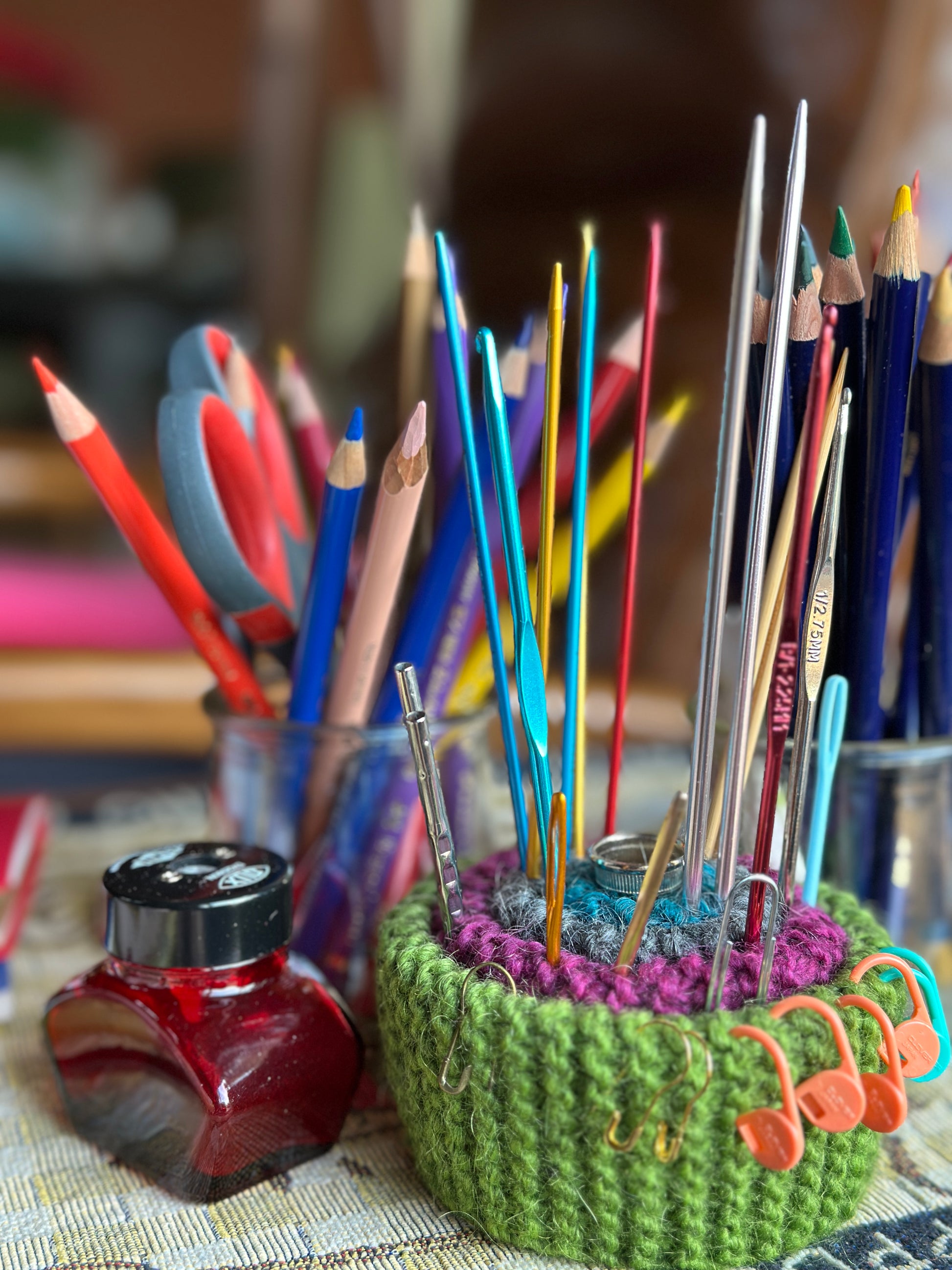 Here's KnitCushion, the pincushion for knitters and quilters. Cleverly constructed of garter stitch bands, KnitCushion is a parking spot for cable stitch needles, darning needles, crochet hooks, and yes, pins and needles. Quilters use the center ring as a home for a favorite thimble and love the generous size of this classy, wool pincushion. Use the jumbo size as a pencil holder at a desk.